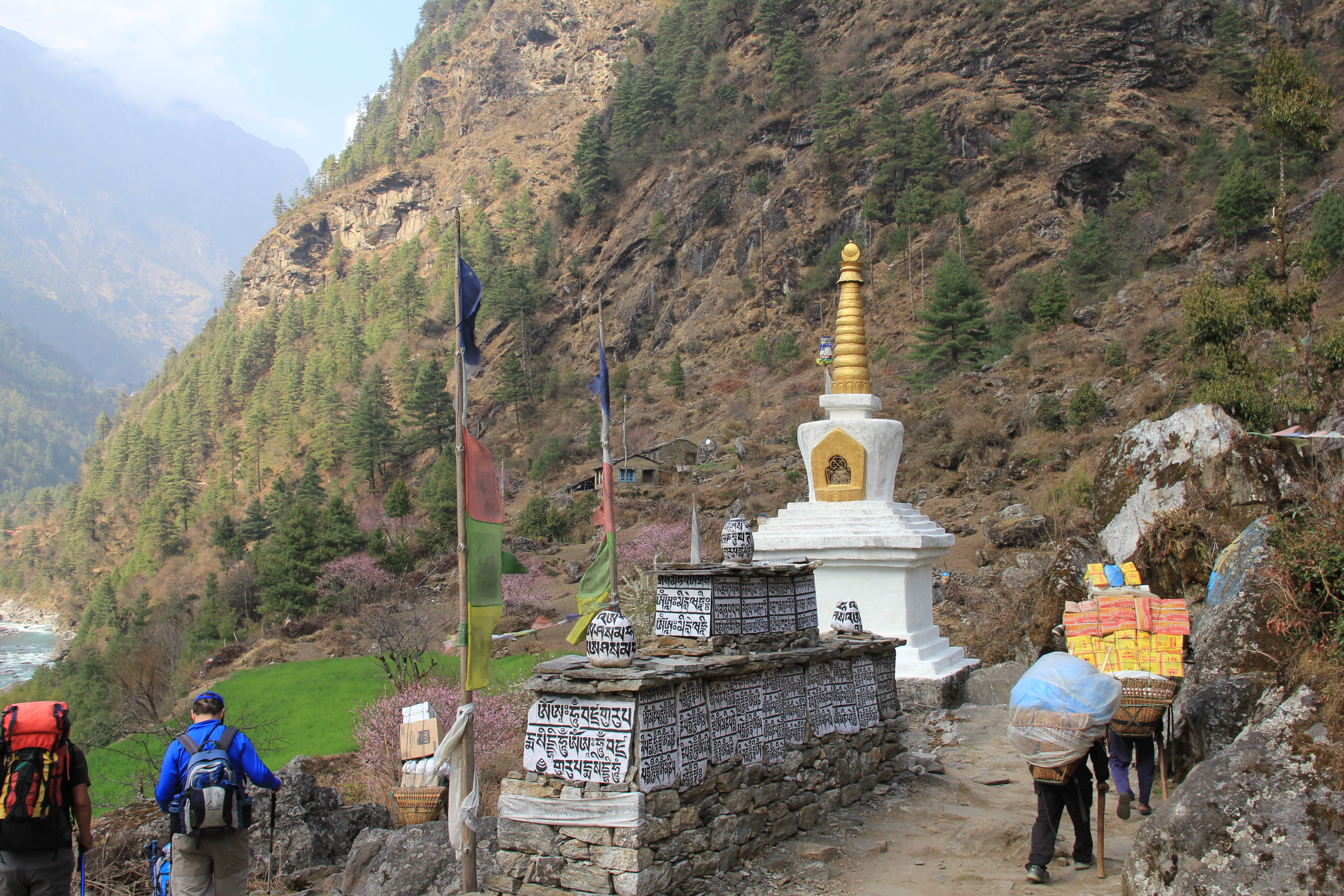 Stupa, Mani Stone and porters carrying heavy loads. Multiple cases of Everest Beer were spotted in some of those baskets! Many porters wear sandals or walk barefoot.