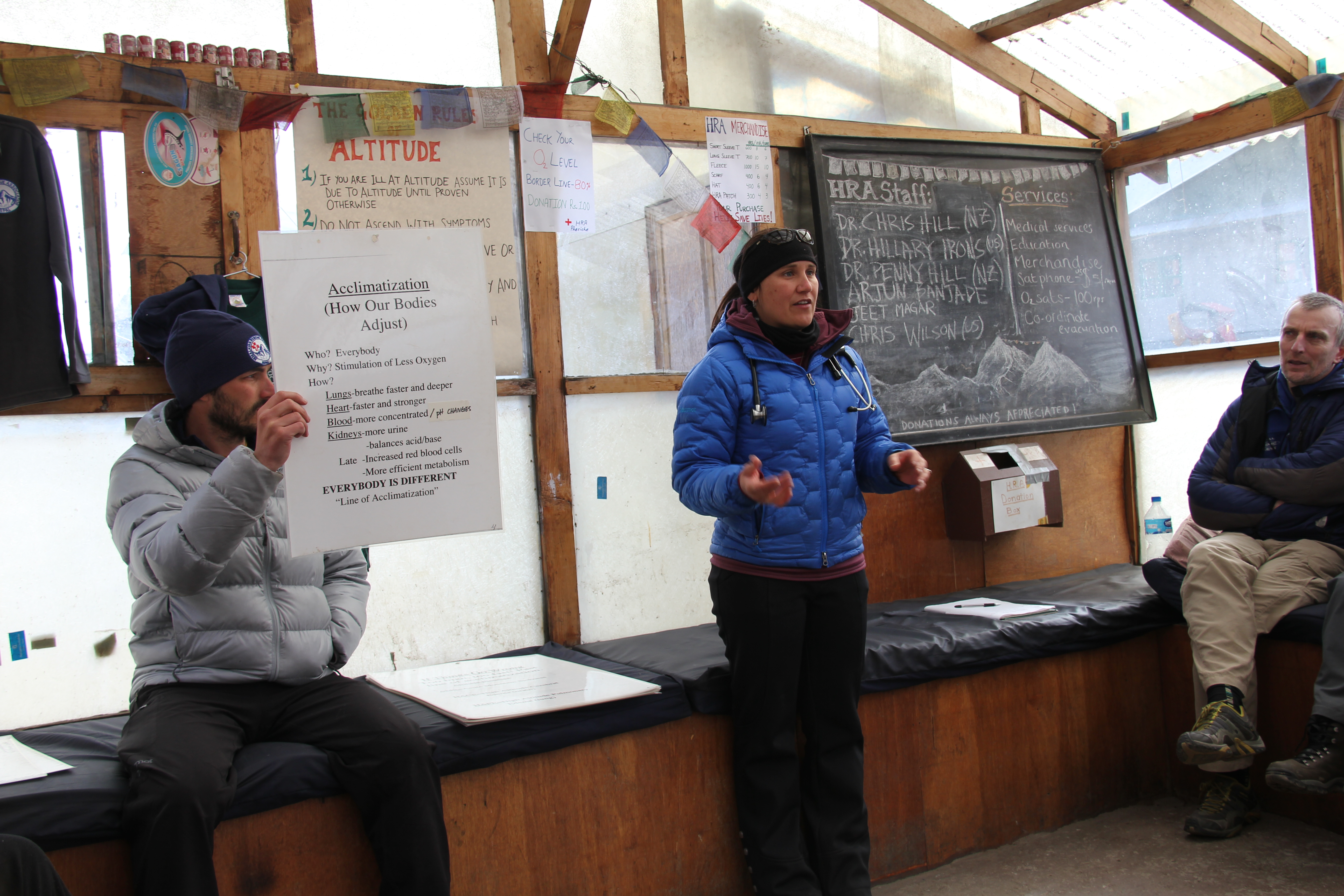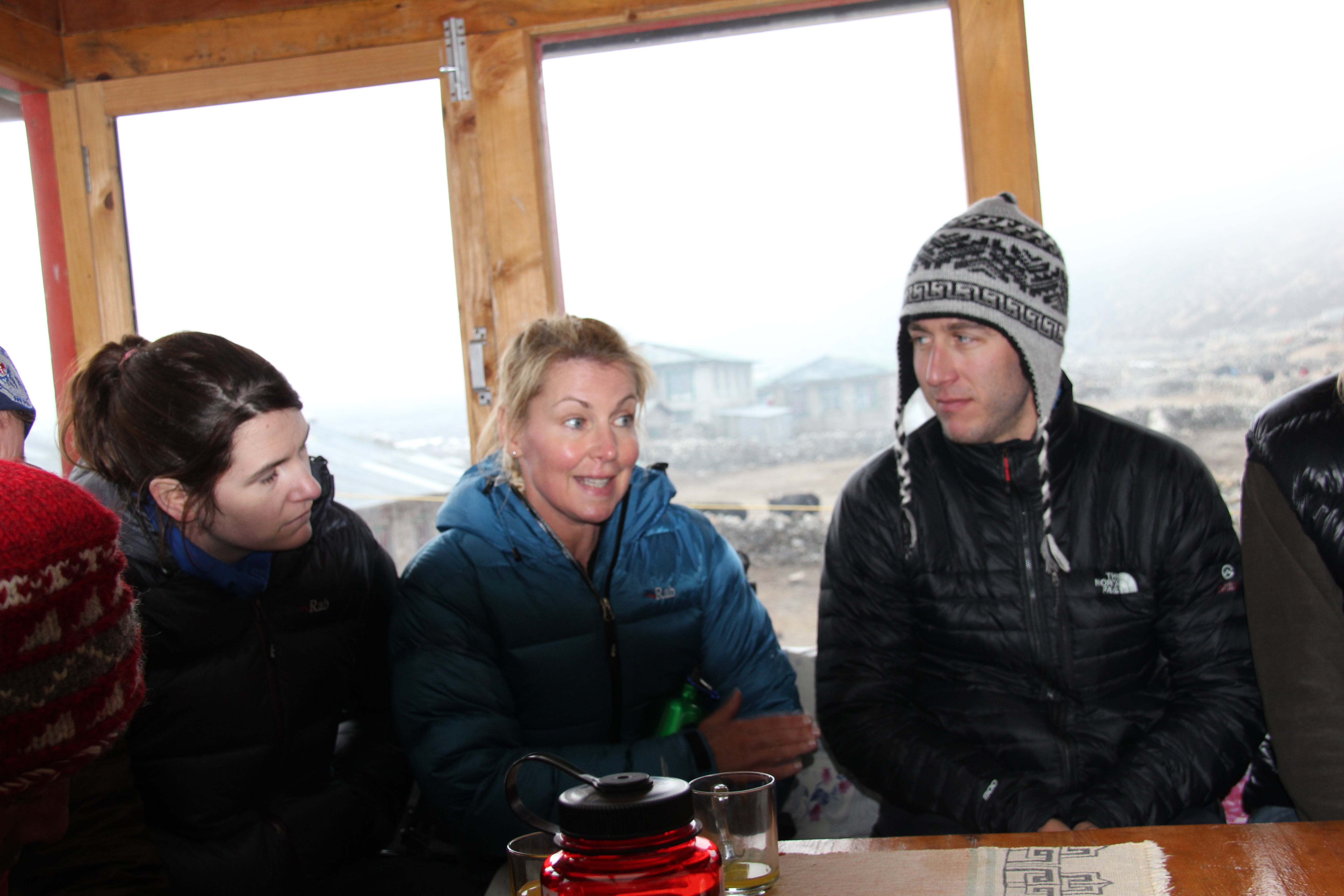 We hiked back in time for grilled yak-cheese sandwiches and tomato soup. Two trekkers who had stayed behind in Namche a night (another case of Traveler’s Diarrhea (TD)) rejoined, all recovered after some antibiotics and rehydration solution, and now we are a full team of 15 again. We attended the daily altitude talk at the HRA clinic.