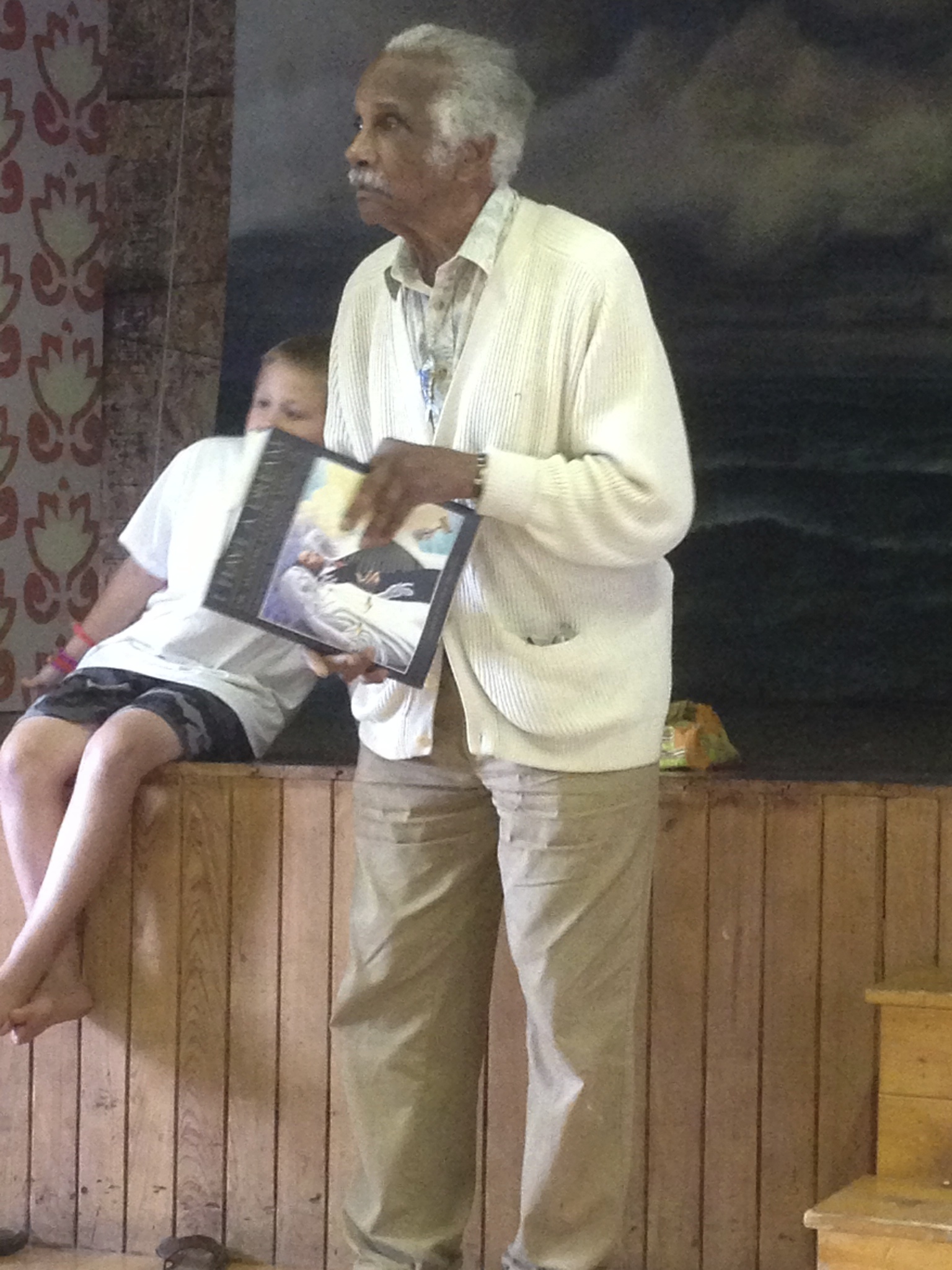 I had the chance to meet Ashley about a half hour before this special event. He was standing outside the Neighborhood house, greeting his neighbors like they were family coming home from time abroad. Ashley welcomed me into his arms and his heart in the same manner. He’s the kind of person you can tell from the first 10 seconds in meeting him, you can trust your instinct that this is a good man. And he makes you want to be a better person, to reach your full potential. In his retirement from teaching at the University, Ashley continues to produce works of art – paintings, stained glass made from local sea glass, as well as teaches workshops, writes books and teaches the kids. In fact if you visit the Islesford website, one of the first pics you see is Ashley instructing a student in his class on the dock. Ashley Bryan is one of those special people, and I knew I had to hear more from him.