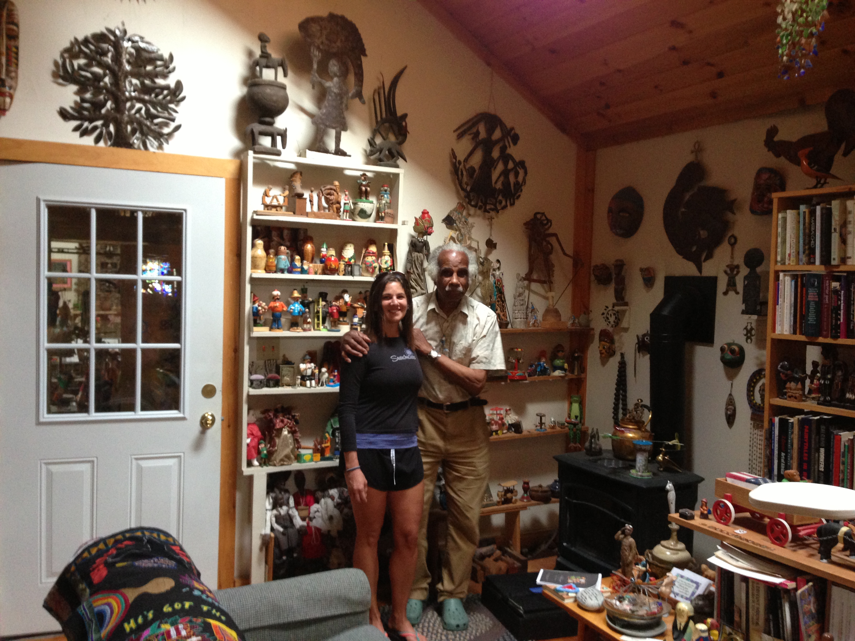 Ashley Bryan is an inspiration, an educator, a teacher and a guide in many ways. I will take his inspiration with me on my journeys. He even guided me to where we should take a picture so that I can always look back at this visit, nestled in the midst of his toys from around the world: